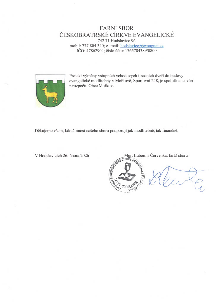 Po průtazích, které byly zaviněny nemocí pana stoláře, se konečně v týdnu od 1. března 2026 uskuteční dlouho plánovaná výměna vstupních dveří v modlitebně v Mořkově.